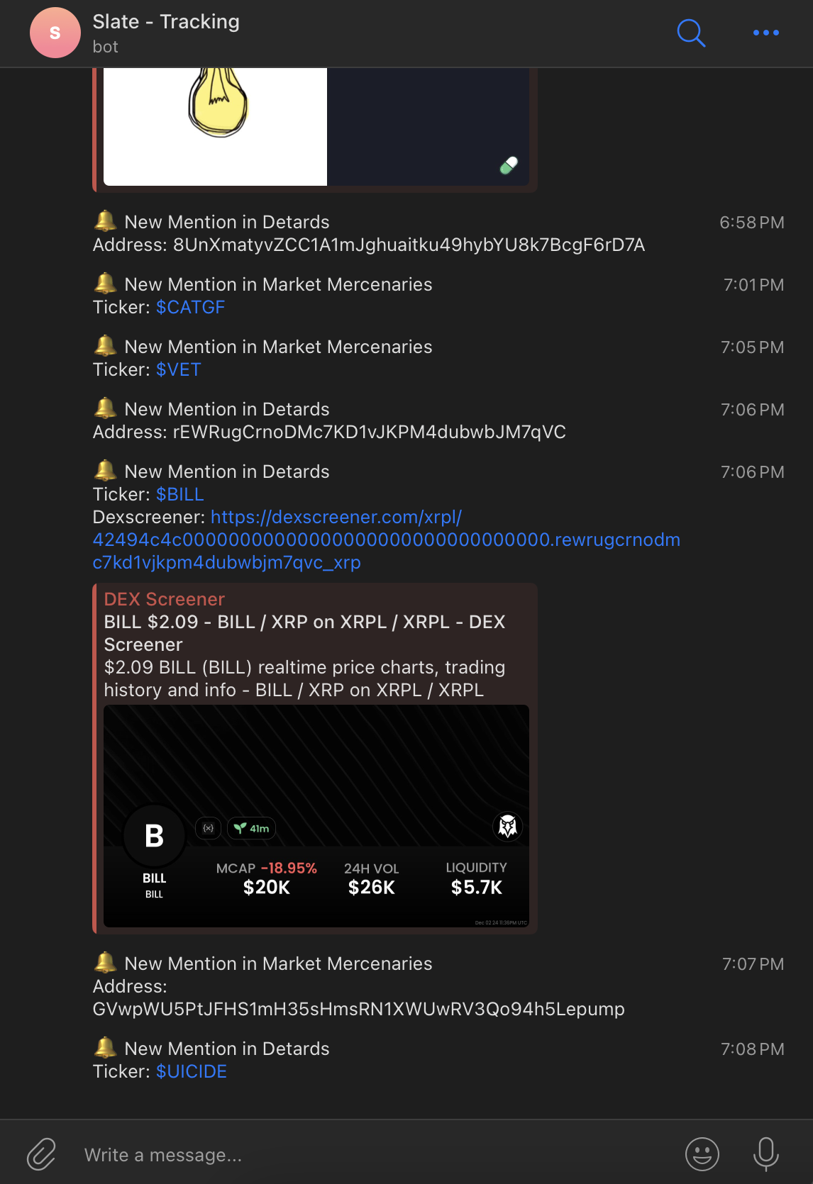 If you've joined many, noisy Discord channels and want notifications for ticker or CA mentions across them, you can do so with the Discord Channel Token Tracker Bot.